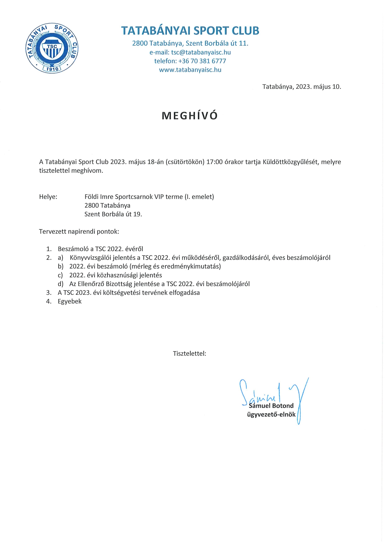 A Tatabányai Sport Club 2025. május 12-én (hétfő) 17:00 órakor tartja rendes Küldöttgyűlését