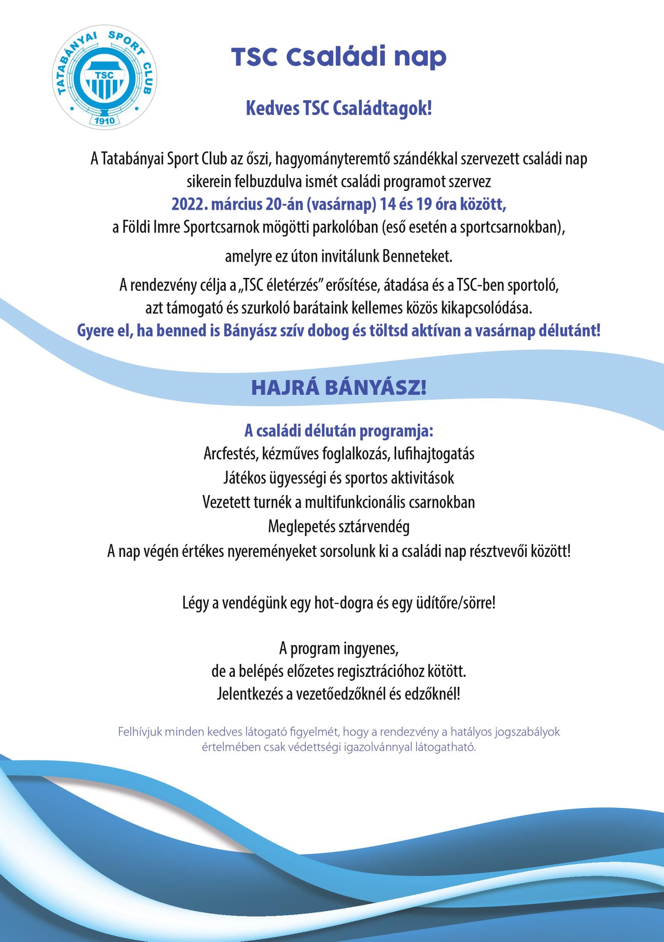 A tavalyi sikereken felbuzdulva idén március 20-án, vasárnap 14-19 óra között rendezi meg Családi Napját a Tatabányai Sport Club.