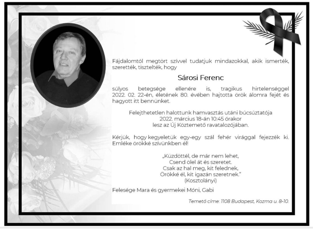 MÁRCIUS 18-ÁN HELYEZIK ÖRÖK NYUGALOMRA SÁROSI FERENCET